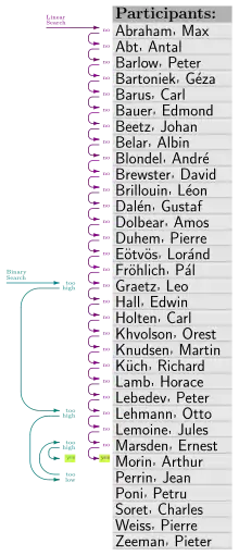 Si se continúa analizando la búsqueda secuencial y si la intención es encontrar a "Zeeman, Pieter" se deben realizar 33 comparaciones pero si se intenta encontrar a "Abt, Antal" solo dos comparaciones son necesarias. Es decir, si se busca el último elemento la cantidad de comparaciones es equivalente a n, donde n es la cantidad de elementos presentes en el vector; pero por otro, también depende de la clave a buscar. En consecuencia, la cantidad de comparaciones necesarias depende de la cantidad de elementos que posea el vector y su orden; y del elemento a buscar, esto es, depende de las entradas del algoritmo. De aquí se puede concluir que para analizar el tiempo de ejecución se podría contar la cantidad de comparaciones realizadas y se la multiplica por el tiempo requerido por cada comparación.