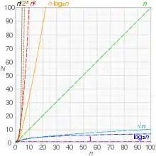 De manera informal, se puede decir que un algoritmo exhibe una tasa de crecimiento del orden de una función matemática si más allá de un cierto tamaño de entrada , la función multiplicada por una constante positiva proporciona un límite superior o límite para el tiempo de ejecución de ese algoritmo. En otras palabras, para un tamaño de entrada dado n mayor que algún y una constante , el tiempo de ejecución de ese algoritmo nunca será mayor que . Este concepto se expresa con frecuencia utilizando la notación O Grande, que brinda una forma conveniente de expresar el peor de los casos para un algoritmo dado.