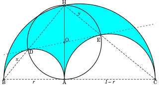 - Demostración: dado que el ángulo BDA es un ángulo recto, el ángulo DBA es igual a π/2 (en radianes) menos el ángulo DAB. Sin embargo, el ángulo DAH también es igual a π/2 menos el ángulo DAB (ya que el ángulo HAB es un ángulo recto). Por lo tanto, los triángulos DBA y DAH son semejantes. Por lo tanto, el ángulo DIA es igual al ángulo DOH, donde I es el punto medio de BA y O es el punto medio de AH. Pero AOH es una línea recta, por lo que el ángulo DOH y DOA son suplementarios. Por lo tanto, la suma de los ángulos DIA y DOA es π. El ángulo IAO es un ángulo recto. La suma de los ángulos en cualquier cuadrilátero es 2π, por lo que en el cuadrilátero IDOA, el ángulo IDO debe ser un ángulo recto. Pero ADHE es un rectángulo, por lo que el punto medio O de AH (la diagonal del rectángulo) es también el punto medio de DE (la otra diagonal del rectángulo). Como I (definido como el punto medio de BA) es el centro del semicírculo BA, y el ángulo IDE es un ángulo recto, entonces DE es tangente al semicírculo BA en D. Por un razonamiento análogo, DE es tangente al semicírculo AC en E, como queda demostrado.