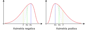 Las medidas de asimetría son indicadores que permiten establecer el grado de simetría (o asimetría) que presenta una distribución de probabilidad de una variable aleatoria sin tener que hacer su representación gráfica. Como eje de simetría consideramos una recta paralela al eje de ordenadas que pasa por la media de la distribución. Si una distribución es simétrica, existe el mismo número de valores a la derecha que a la izquierda de la media, por tanto, el mismo número de desviaciones con signo positivo que con signo negativo. Decimos que hay asimetría positiva (o a la derecha) si la "cola" a la derecha de la media es más larga que la de la izquierda, es decir, si hay valores más separados de la media a la derecha. Diremos que hay asimetría negativa (o a la izquierda) si la "cola" a la izquierda de la media es más larga que la de la derecha, es decir, si hay valores más separados de la media a la izquierda.