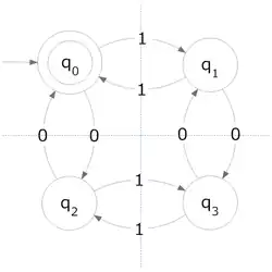 Autómata finito determinista que reconoce el lenguaje regular conformado exclusivamente por las cadenas con un número par de ceros y un número par de unos.