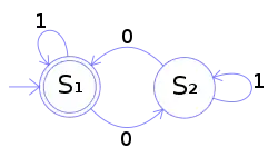Ejemplo de AFD con dos estados. En nodo de la izquierda es inicial y de aceptación.