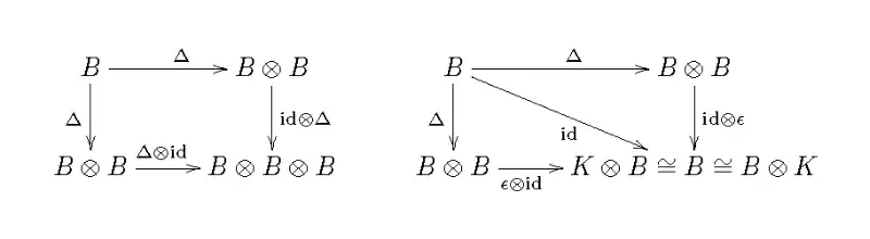 Así, los diagramas 1 y 3 afirman que Δ: B → B ⊗ B es un homomorfismos entre las álgebras asociativas unitarias (B, ∇, η) y (B ⊗ B, ∇2, η2)