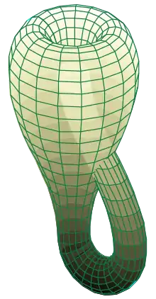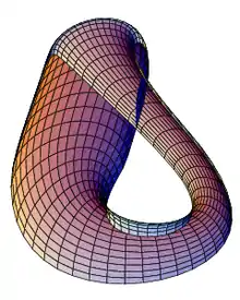 Seccionando una botella de Klein en dos mitades a lo largo de su plano de simetría resultan dos bandas de Möbius, cada una imagen especular de la otra. Una de ellas es la imagen de la derecha. Recuerde que la intersección de la imagen no está realmente allí. De hecho, también es posible cortar la botella de Klein en una única banda de Möbius.