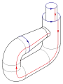 Para ello, pegamos las flechas rojas del cuadrado, (lados derecho e izquierdo) resultando un cilindro. Para pegar los extremos de manera que las flechas de los círculos coincidan, pasamos un extremo por el lado del cilindro. Nótese que esto crea una autointersección circular. Esta es una inmersión de la botella de Klein en tres dimensiones.