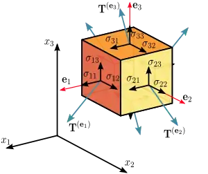 En la ingeniería, las tensiones en el interior de un sólido rígido o líquido también son descritas por un tensor. Si se selecciona un elemento superficial particular en el material, el material en un lado de la superficie aplicará una fuerza en el otro lado. En general, esta fuerza no será ortogonal a la superficie, sino que dependerá de la orientación de la superficie de una manera lineal. Esto es descrito por un tensor del tipo (2, 0), o más exactamente por un campo tensorial del tipo (2, 0) puesto que las tensiones pueden cambiar punto a punto.
