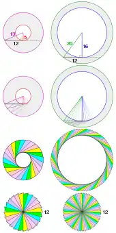 Ahora bien, si todas las tangentes (de longitud constante) utilizadas en la construcción del anillo se trasladan para que sus puntos de tangencia coincidan, el resultado es un disco circular de radio conocido (y área fácilmente calculable). De hecho, dado que el radio del círculo interno es irrelevante, se podría haber comenzado con un círculo de radio cero (un punto) y barrer un círculo alrededor de un círculo de radio cero, lo que es indistinguible de simplemente rotar un segmento de línea alrededor de uno de sus puntos finales y barrer un círculo.