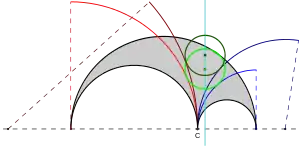 Dos de los infinitos círculos de Woo (negro y verde), que tienen su centro en la recta de Schoch (cian) y son tangentes a sus correspondientes arcos