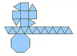 Desarrollo de la cúpula cuadrada giroelongada, con las caras coloreadas según su tipo de simetría.