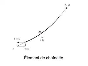 La ecuación diferencial () puede deducirse aplicando el equilibrio de fuerzas a una porción infinitesimal de catenaria. Aplicando el equilibrio de fuerzas a las fuerzas horizontales y verticales se tiene que:
