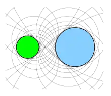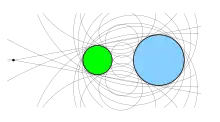 Si se construyen los círculos tangentes para cada posible par de puntos antihomológicos, se obtienen dos familias de círculos, una para cada centro homotético. La familia de círculos del centro homotético externo es tal que cada círculo tangente contiene «los dos círculos dados» o ninguno (Figura 6). Por otro lado, los círculos de la otra familia siempre contienen solo uno de los círculos dados (Figura 7).