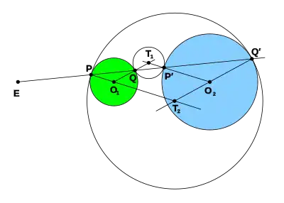 Sean dos círculos dados, con centros O1 y O2 (Figura 5). E es su centro homotético externo. Se traza un rayo arbitrario desde E que cruza los dos círculos en P, Q, P′ y Q′. Extiéndase O1Q y O2P′ hasta que se intersequen en T1. Se comprueba fácilmente que los triángulos O1PQ y O2P′Q′ son semejantes debido a su homotecia. También son triángulos isósceles porque O1P = O1Q (radio), y por lo tanto, ∠O1PQ = ∠O1QP = ∠O2P& prime;Q′ = ∠O2Q′P′ = T1QP′ = ∠T1P′Q. Así, T1P′Q también es isósceles y se puede construir un círculo con el centro T1 y el radio T1P′ = T1Q. Este círculo es tangente a los dos círculos dados en los puntos Q y P′.