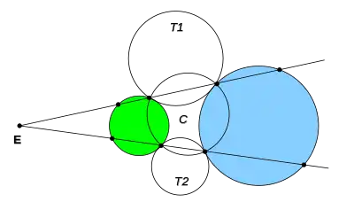 Para demostrarlo, considérense dos rayos del centro homotético, que se cruzan con los círculos dados (Figura 8). Existen dos círculos tangentes T1 y T2 que tocan los círculos dados en los puntos antihomológicos. Como ya se ha demostrado, estos puntos se encuentran en un círculo C y, por lo tanto, los dos rayos son ejes radicales para C / T1 y C / T2. Entonces, el punto de intersección de los dos ejes radicales también debe pertenecer al eje radical de T1 / T2. Este punto de intersección es el centro homotético E.