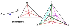 - El baricentro de un triángulo de vértices {A, B, C} se encuentra en la intersección de las tres medianas del triángulo. En ese mismo punto se encuentra también el baricentro de la superficie del triángulo [ABC].
