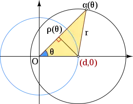 ![]() Se hace el cambio y y se simplifica como: Finalmente se toma la raíz positiva para que El polo no puede ser exterior a la circunferencia porque el dominio del parámetro no queda definido continuamente en la parametrización. |