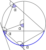 Si el ángulo inscrito, semi-inscrito y ex-inscrito tienen la misma amplitud , entonces, determinan la misma longitud de arco, de color azul en la imagen, sobre una misma circunferencia de radio . Si el ángulo está en grados: