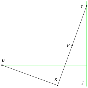 Para ver esto,[7] sea la distancia entre B y J igual a 2a. Por traslación y rotación, se hace que B=(−a, 0) y J pasa a ser la línea recta x=a. Sea ahora P=(x, y) y sea ψ el ángulo entre SB y el eje x; esto es igual al ángulo entre ST y J. Por construcción, PT = a, por lo que la distancia de P a J es a sen ψ. En otras palabras, a-x = a sen ψ. Además, SP = a es la coordenada y de (x, y) si se gira en un ángulo ψ, por lo que a = (x + a) sen ψ + y cos ψ. Después de la simplificación, se generan las ecuaciones paramétricas