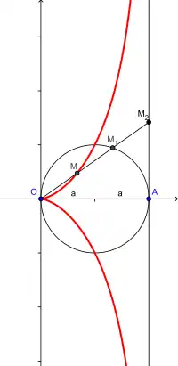 Sea la circunferencia C de radio a. Por traslación y rotación, se puede tomar O como el origen de coordenadas y el centro de la circunferencia como (a, 0). Entonces, el punto A pasa a tener las coordenadas (2a, 0). Con estas condiciones, las ecuaciones polares de LyC son: