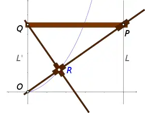 Para comprobar esto, siendo O el origen y L la línea recta de ecuación x=2a (como antes). Sea P el punto (2a, 2at); entonces Q es (0, 2at) y la ecuación de la línea recta OP es y=tx. La recta que pasa por Q perpendicular a OP es