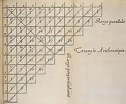 En 1654, Blaise Pascal entabló correspondencia con Pierre de Fermat sobre ciertos problemas de probabilidad, correspondencia que daría origen a su Traité du triangle arithmétique, considerado uno de los trabajos pioneros en el estudio moderno de la probabilidad. En ese trabajo, entre otras cosas, estudia lo que hoy se conoce como triángulo de Pascal que es un arreglo de números definido a continuación.
