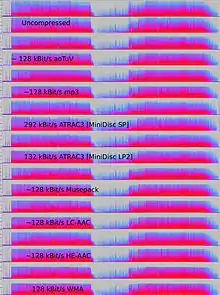 Para determinar qué información de una señal de audio es irrelevante desde el punto de vista perceptivo, la mayoría de los algoritmos de compresión con pérdidas utilizan transformaciones como la transformada de coseno discreta (MDCT) para convertir las formas de onda muestreadas en el dominio del tiempo en un dominio de transformación, normalmente el dominio de la frecuencia. Una vez transformadas, las frecuencias de los componentes pueden priorizarse según su audibilidad. La audibilidad de los componentes espectrales se evalúa utilizando el umbral absoluto de audición y los principios de enmascaramiento simultáneo-el fenómeno en el que una señal es enmascarada por otra señal separada por la frecuencia-y, en algunos casos, enmascaramiento temporal-en el que una señal es enmascarada por otra señal separada por el tiempo. También se pueden utilizar los contornos de igual sonoridad para ponderar la importancia perceptiva de los componentes. Los modelos de la combinación oído-cerebro humano que incorporan estos efectos suelen denominarse modelo psicoacústicos.[24]