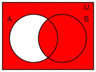 es decir, es la unión del complementario de A y del conjunto B, o equivalentemente, el complementario de A menos B.
