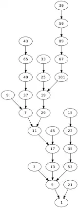 - Empezando en n = 16172831301712733, la sucesión tiene 1300 pasos para llegar a 1.