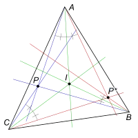 En geometría, el conjugado isogonal de un punto , respecto de un triángulo se construye reflejando las rectas que unen con cada uno de los vértices del triángulo en torno a las bisectrices de , y respectivamente. Estas tres rectas reflejadas concurren en el punto conjugado isogonal de . Esta definición es válida solamente para los puntos del plano que no se hallen sobre los lados del triángulo .