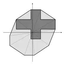 Del mismo modo, se define que una envolutra de disco, o envolutra absolutamente convexa, de un conjunto es el disco más pequeño (con respecto al inclusión de conjuntos) que contiene a [1] La envoltura de disco de se denotará por o y es igual a cada uno de los siguientes conjuntos: que es la envoltura convexa del envoltura equilibrada de ; así,