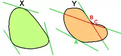 donde denota el producto escalar usual en entre y . Intuitivamente, esto dice que, por cada punto en el borde del conjunto (ósea, cada punto ) existe un vector que divide el plano entero, y que cada punto existe solamente en el hiperplano con ángulo que subtiende a ese vector trasladado por .