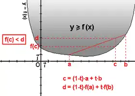 Se dice que una función real, definida sobre un intervalo es convexa si el dominio del plano situado por encima de su curva (en gris en la figura) lo es. Sin sorpresa, las consideraciones anteriores se aplican: Solo importa la frontera del dominio, es decir la curva de ecuación . La convexidad se expresa así: Para cualquier par en el intervalo , y cualquier