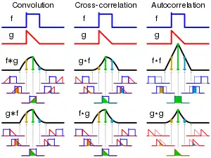 En matemáticas, y en particular análisis funcional, una convolución es un operador matemático que transforma dos funciones f y g en una tercera función que en cierto sentido representa la magnitud en la que se superponen f y una versión trasladada e invertida de g. Una convolución es un tipo muy general de media móvil, como se puede observar si una de las funciones se toma como la función característica de un intervalo.