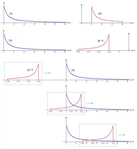 La convolución de y se denota . Se define como la integral del producto de ambas funciones después de desplazar una de ellas una distancia .