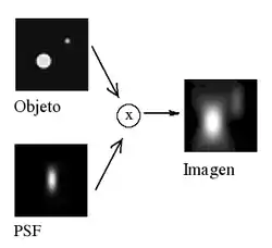 - En óptica, muchos tipos de manchas se describen con convoluciones. Una sombra (p. ej. la sombra en la mesa cuando se tiene la mano entre esta y la fuente de luz) es la convolución de la forma de la fuente de luz que crea la sombra y del objeto cuya sombra se está proyectando. Una fotografía desenfocada es la convolución de la imagen correcta con el círculo borroso formado por el diafragma del iris.