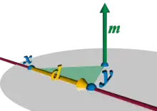 Una línea recta L en el espacio euclídeo tridimensional está determinada por dos puntos de los que contiene distintos entre sí, o también por dos planos distintos que la contienen. Considérese el primer caso, con los puntos x = (x1, x2, x3) e y = (y1, y2, y3). El desplazamiento del vector de x a y es distinto de cero porque los puntos son distintos y representan la dirección de la línea. Es decir, cada desplazamiento entre puntos en L es un múltiplo escalar de d = y - x. Si una partícula física de unidad de masa se moviera de x a y, tendría un momento respecto al origen. El equivalente geométrico es un vector cuya dirección es perpendicular al plano que contiene L y el origen, y cuya longitud es igual al doble del área del triángulo formado por el desplazamiento y el origen. Tratando los puntos como desplazamientos desde el origen, el momento es m = x×y, donde "×" denota el producto vectorial. Para una línea recta fija L, el área del triángulo es proporcional a la longitud del segmento entre x e y, dado que esta distancia es la base de un triángulo cuya altura (y por lo tanto, su área) permanece constante aunque la base se deslice sobre la línea paralelamente a sí misma. Por definición, el vector del momento es perpendicular a cada desplazamiento sobre la línea recta, por lo que d•m = 0, donde "•" denota el vector producto escalar.