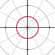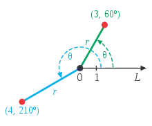 - Un punto, definido por un ángulo y una distancia, es el mismo punto que el indicado por ese mismo ángulo más un número de revoluciones completas y la misma distancia. En general, el punto (, θ) se puede representar como (, θ ± ×360°) o (−, θ ± (2 + 1)180°), donde es un número entero cualquiera.[4]