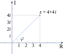 donde i es la unidad imaginaria. De forma alternativa, se puede escribir en forma polar (mediante las fórmulas de conversión dadas arriba) como