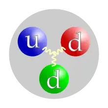 La cromodinámica cuántica es una teoría de gauge que describe la interacción entre quarks y gluones. Los quarks son los fermiones de esta teoría y desempeñan un papel análogo a los electrones y neutrinos del modelo electrodébil, los gluones son los bosones de gauge de la teoría, y desempeñan un papel análogo a los fotones en la QED.[1] Los gluones son representables mediante un campo de Yang-Mills cuya simetría interna es el grupo SU(3).