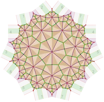 El dessin d'enfant de la cuártica de Klein asociado con el mapa del cociente por su grupo de automorfismos (con la esfera de Riemann como cociente) es precisamente el 1-esqueleto del teselado heptagonal de orden 3.[11] Es decir, el mapa del cociente se ramifica sobre los puntos 0, 1728 y ∞; dividir por 1728 produce una función de Belyi (ramificada en 0, 1 y ∞), donde los 56 vértices (puntos negros del diseño) se encuentran sobre 0, los puntos medios de las 84 aristas (puntos blancos del diseño) se encuentran sobre 1 y los centros de los 24 heptágonos se encuentran sobre el infinito. El diseño resultante es "platónico", es decir, aristas-transitivo y "limpio" (cada punto blanco tiene valencia 2).