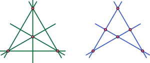 El dual proyectivo de un cuadrángulo completo es un cuadrilátero completo, y viceversa. Para dos cuadrángulos completos o dos cuadriláteros completos, existe una homografía única que toma una de las dos configuraciones en el otro.[3]