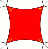 Squares can tile the hyperbolic plane with 5 around each vertex, with each square having 72-degree internal angles. The Schläfli symbol is {4,5}. In fact, for any n ≥ 5 there is a hyperbolic tiling with n squares about each vertex.