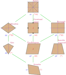Cada simetría de subgrupo permite uno o más grados de libertad para los cuadriláteros irregulares. r8 es simetría completa del cuadrado, y a1 no tiene simetría. d4 es la simetría de un rectángulo, y p4 es la simetría de un rombo. Estas dos formas son duales entre sí, y tienen la mitad del orden de simetría del cuadrado. d2 es la simetría de un trapecio isósceles, y p2 es la simetría de una cometa. g2 define la geometría de un paralelogramo.