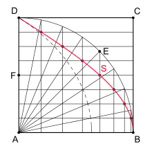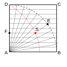 Otra construcción es la siguiente: DAB es un cuadrante circular en el que la línea DA y el arco DB se dividen en el mismo número de partes iguales. Los radios se dibujan desde el centro del cuadrante hasta los puntos de división del arco, y estos radios son intersectados por las líneas trazadas paralelas a AB y a través de los puntos correspondientes en el radio DA. El lugar de estas intersecciones es la cuadratriz.