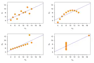 Cada conjunto consta de once puntos (x, y) y fueron publicados en 1973 por el estadístico Francis John Anscombe. El cuarteto es una demostración de la importancia de mirar gráficamente un conjunto de datos antes de analizarlos.