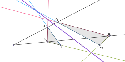 "Si dos triángulos se encuentran en un plano tal que las líneas que conectan los vértices correspondientes de los triángulos se encuentran en un punto, entonces los tres puntos, en los que las prolongaciones de los tres pares de lados correspondientes de los triángulos se cruzan, se encuentran en una línea recta".