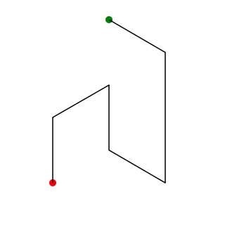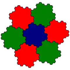 | Cuarta iteración de la curva de Gosper | La línea que une el punto rojo con el verde muestra el primer paso de la construcción de la curva. |