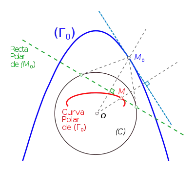 Entonces, se puede definir muy simplemente la curva dual de cualquier curva regular: es la unión de los polos de las tangentes a la curva o, lo que es equivalente, la envolvente de las polares de los puntos de la curva. Siendo la inversión una transformación involutiva, se comprueba fácilmente que el dual de la curva dual no es otra que la curva inicial, de ahí el nombre de "transformación por polares recíprocas" que se le da a esta transformación.