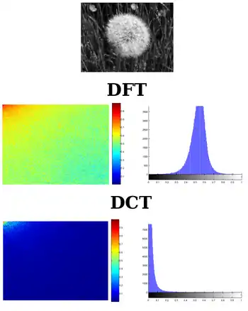 - La DCT tiene una buena capacidad de compactación de la energía al dominio transformado, es decir, que la transformada de coseno discreta consigue concentrar la mayor parte de la información en pocos coeficientes transformados tal y como muestra la imagen.