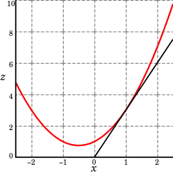 Al realizar esta derivada obtenemos la expresión que nos permite calcular la pendiente de la recta tangente a dicha función en un punto dado. Esta recta es paralela al plano formado por el eje de la incógnita respecto a la cual se ha hecho la derivada con el eje que representa los valores de la función.