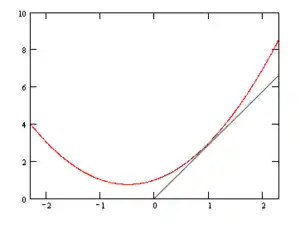 Para hallar la pendiente de la recta tangente a la función en y paralela al plano , tratamos como una constante. La gráfica y este plano se muestran a la derecha. Abajo, véase el aspecto de la función en el plano . Hallando la derivada de la ecuación suponiendo que es una constante, encontramos que la pendiente de en el punto es: